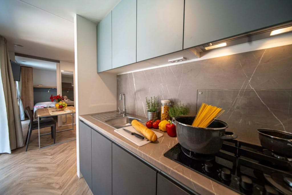 Lodge Laguna (veličine cca. 35 m²): 2 spavaće sobe - jedna sa bračnim krevetom (160x200cm) i jedna sa krevetom na sprat i krevetom za jednu osobu (75x200cm), dnevna soba sa kaučom na razvlačenje, čajna kuhinja sa štednjakom, mikrovalnom pećnicom, sudoperom, loncima i tavama, frižiderom, stolom i stolicama, SAT TV/TV, dnevna soba sa kaučom na razvlačenje, 2 kupatila sa tuš kabinom, umivaonikom i WC-om, drvena terasa opremljena sa stolom i stolicama, rezervirano parkirno mjesto za automobile/motocikle.
