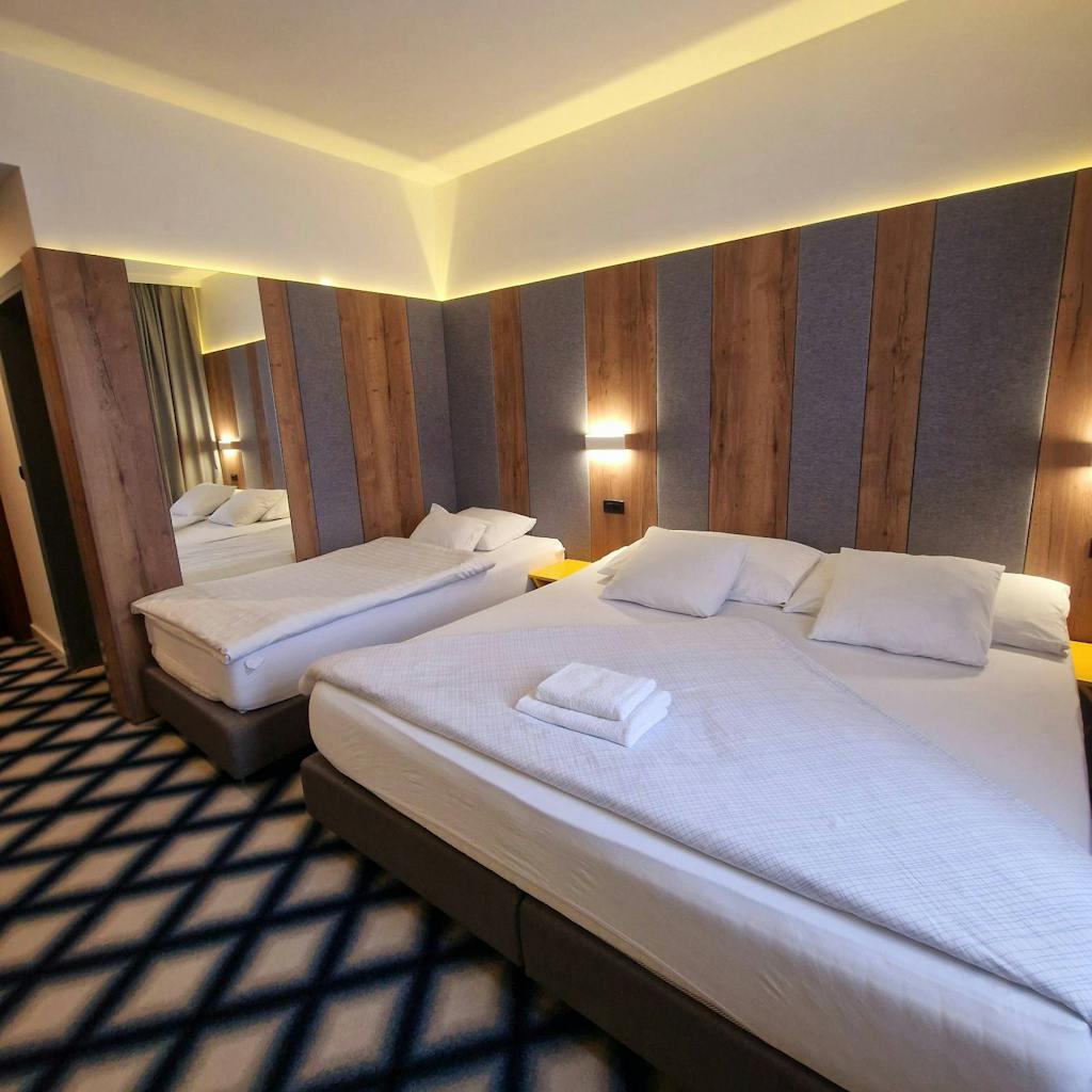 Dvokrevetna Superior soba: Ova savremeno uređena smještajna jedinica pruža udoban boravak, bilo da ste na poslovnom putu ili uživate u odmoru. Bilo da ste sami ili sa partnerom. Soba je opremljena bračnim krevetom, dok postoji mogućnost razdvajanja kreveta za veći komfor. Prostorno i elegantno kupatilo sadrži tuš kabinu, fen za kosu, te moderno ogledalo sa LED svjetlima, pružajući vam sve što je potrebno za opuštanje. Soba je okrenuta prema prirodi i okolini grada, pružajući vam prelijep pogled i mogućnost uživanja u svježem zraku uz jutarnju kafu. Ovaj prostor je savršen za one koji žele uživati u jednostavnosti, udobnosti i miru.