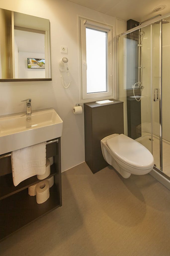 Premium mobilne kućice (34m² + 12m² terasa): od 20 do 200 m do mora, bazena ili plaže ili restorana. Prostrani i svetli interijeri uključuju modernu kuhinju, udobne spavaće sobe i prostrani dnevni boravak. Privatna terasa sa pogledom na prirodu savršeno je mesto za jutarnju kafu, popodnevni odmor ili večernje trenutke pod zvezdama.